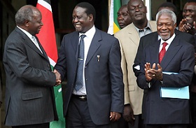 | President Mwai Kibaki and Prime Minister Raila Odinga shake hands after Kofi Annan (Rt.) brokered the peace deal. Photo courtesy of Simon Maina /AFP/ Getty Images |